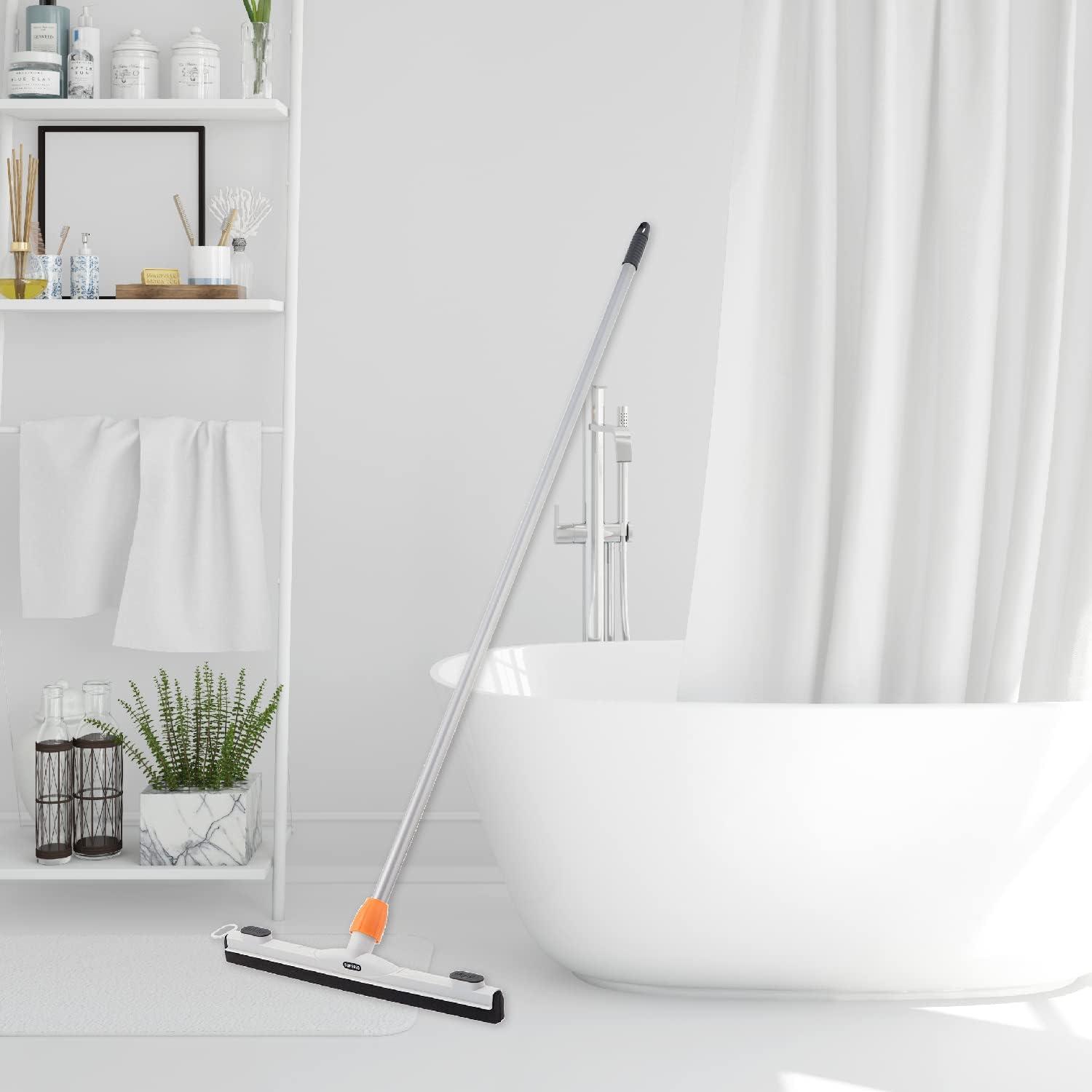 The floor squeegee is designed for use on concrete, tile, laminate, garage, and bathroom floors.