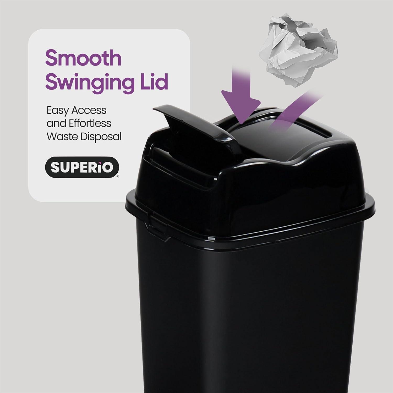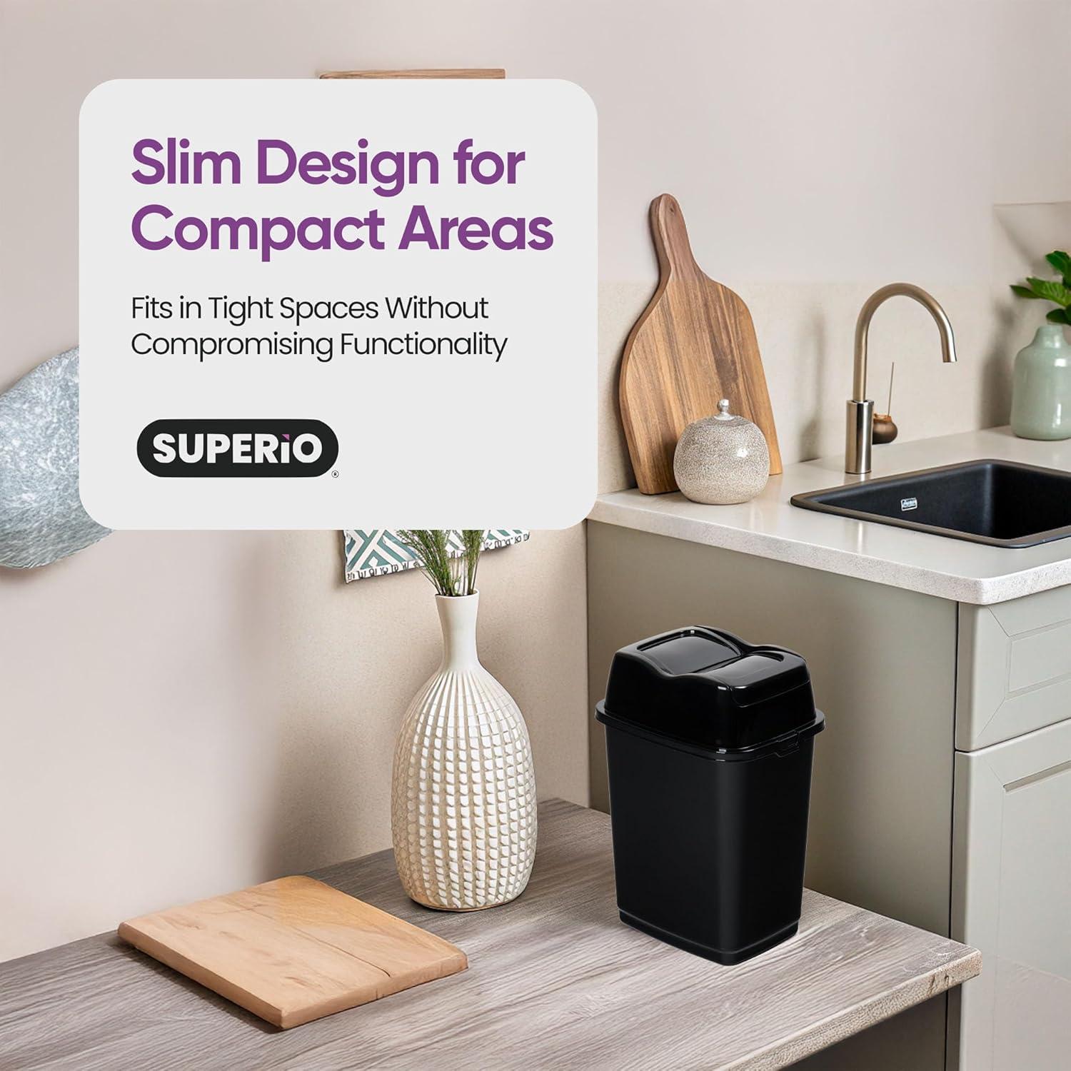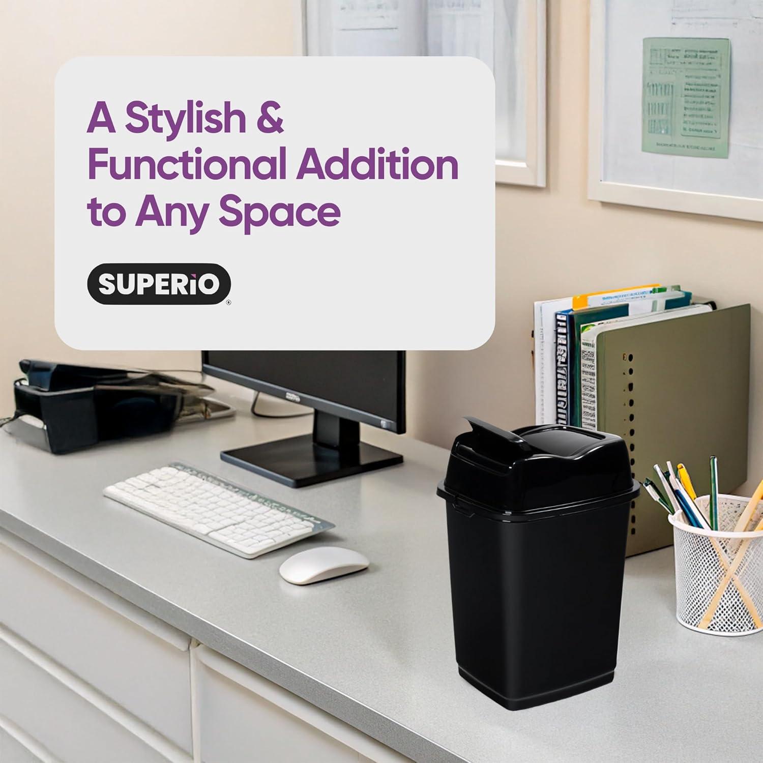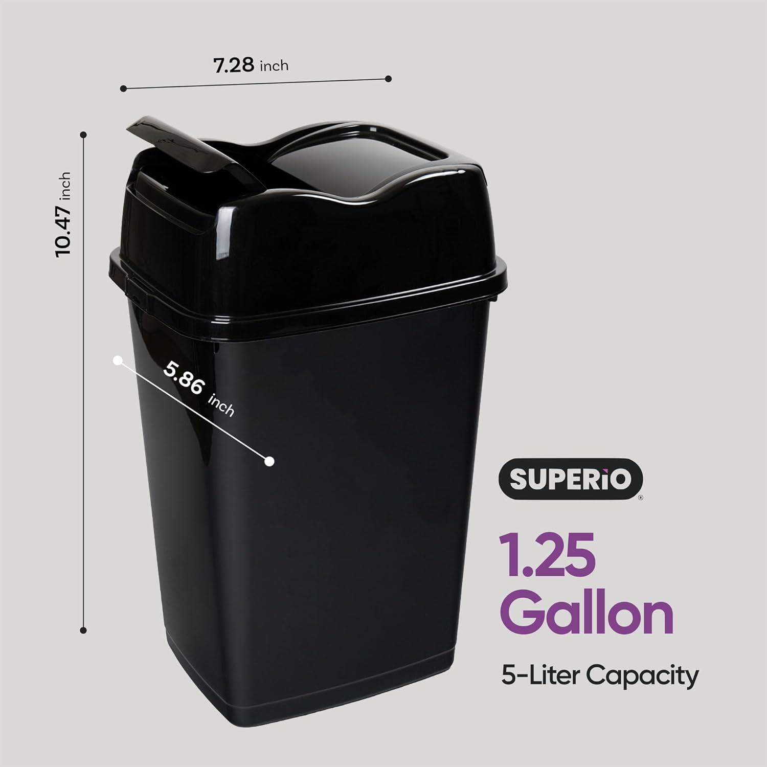 Superio Brand's Garbage Can with Swing Top-Split Lid combines functionality and style, making waste disposal effortless and efficient. Its smooth-swinging split lid allows for quick, mess-free trash disposal while closing securely to keep waste hidden and odors contained. Ideal for bedrooms, bathrooms, or offices, this trash can offers convenience and a clean, streamlined appearance. With a 1.25-gallon (5-liter) capacity, this trash bin can fit effortlessly under a desk or a bathroom sink. The slim profile is designed to fit seamlessly into tight spaces, saving valuable room in busy areas. The sleek black finish and modern design make this trash bin a versatile and attractive addition to any setting. Constructed from durable plastic, this trash can with lid is built to withstand daily use while remaining lightweight and easy to handle. Its fingerprint-resistant surface keeps it looking clean and polished, even with frequent handling. Equipped with sturdy side handles, it ensures a secure grip for hassle-free trash removal. Combining practicality, durability, and style, this swing lid trash can is the perfect solution for your waste management needs.