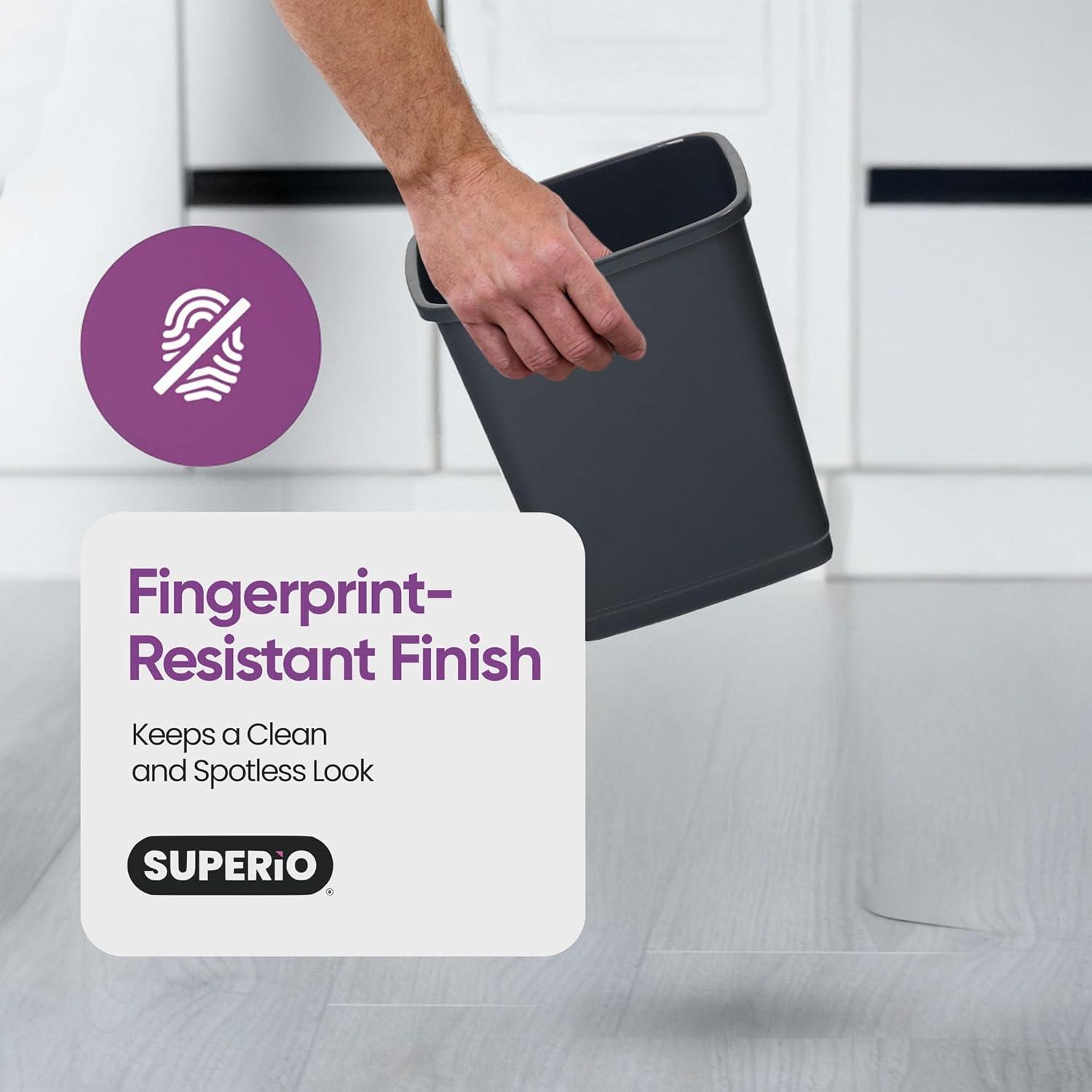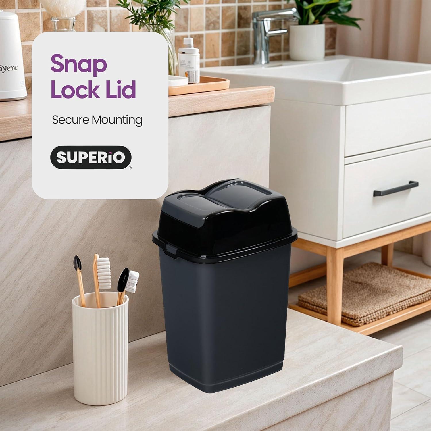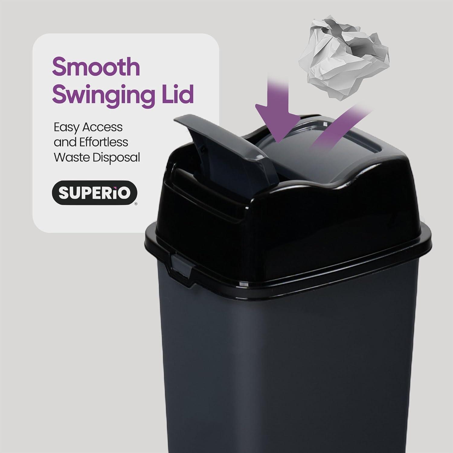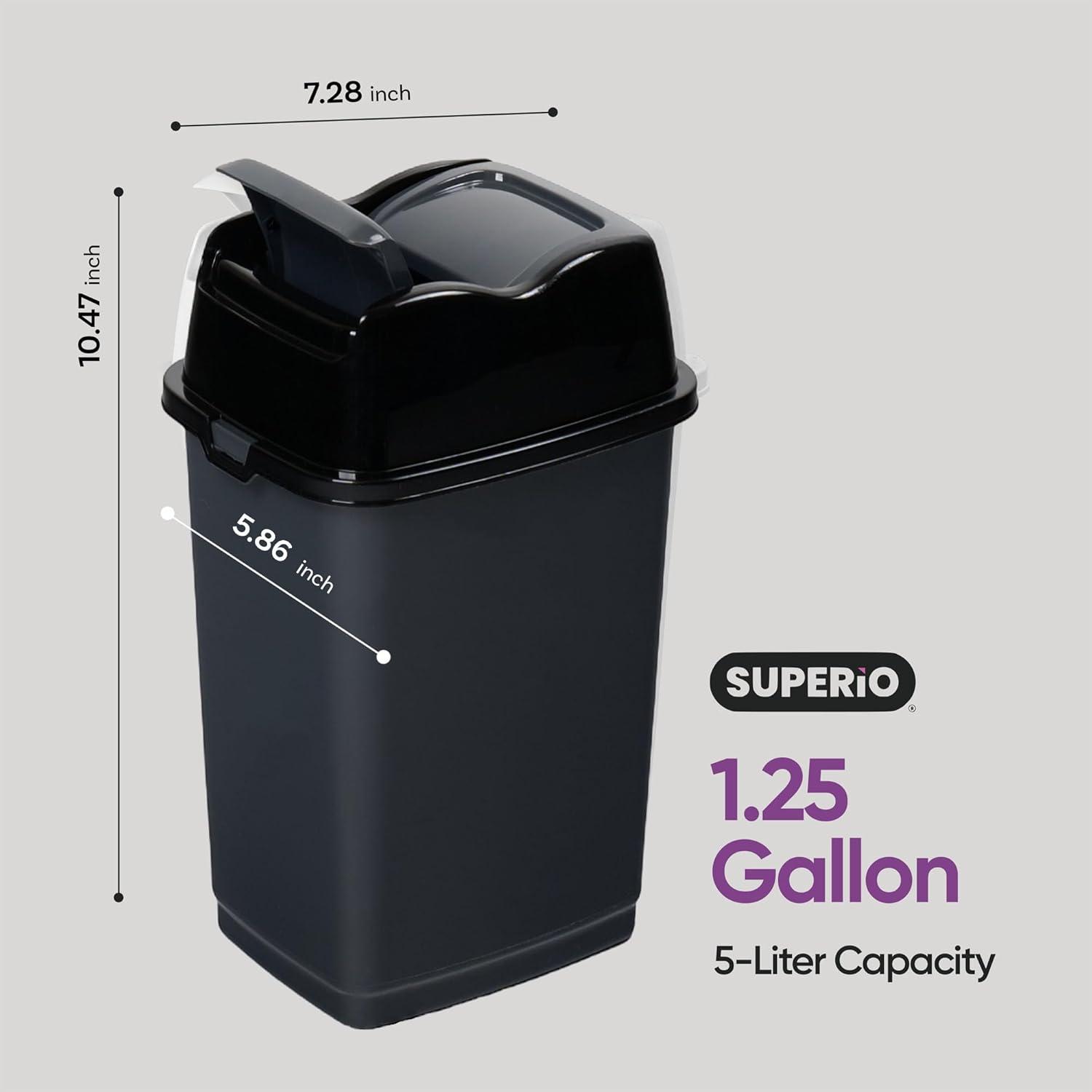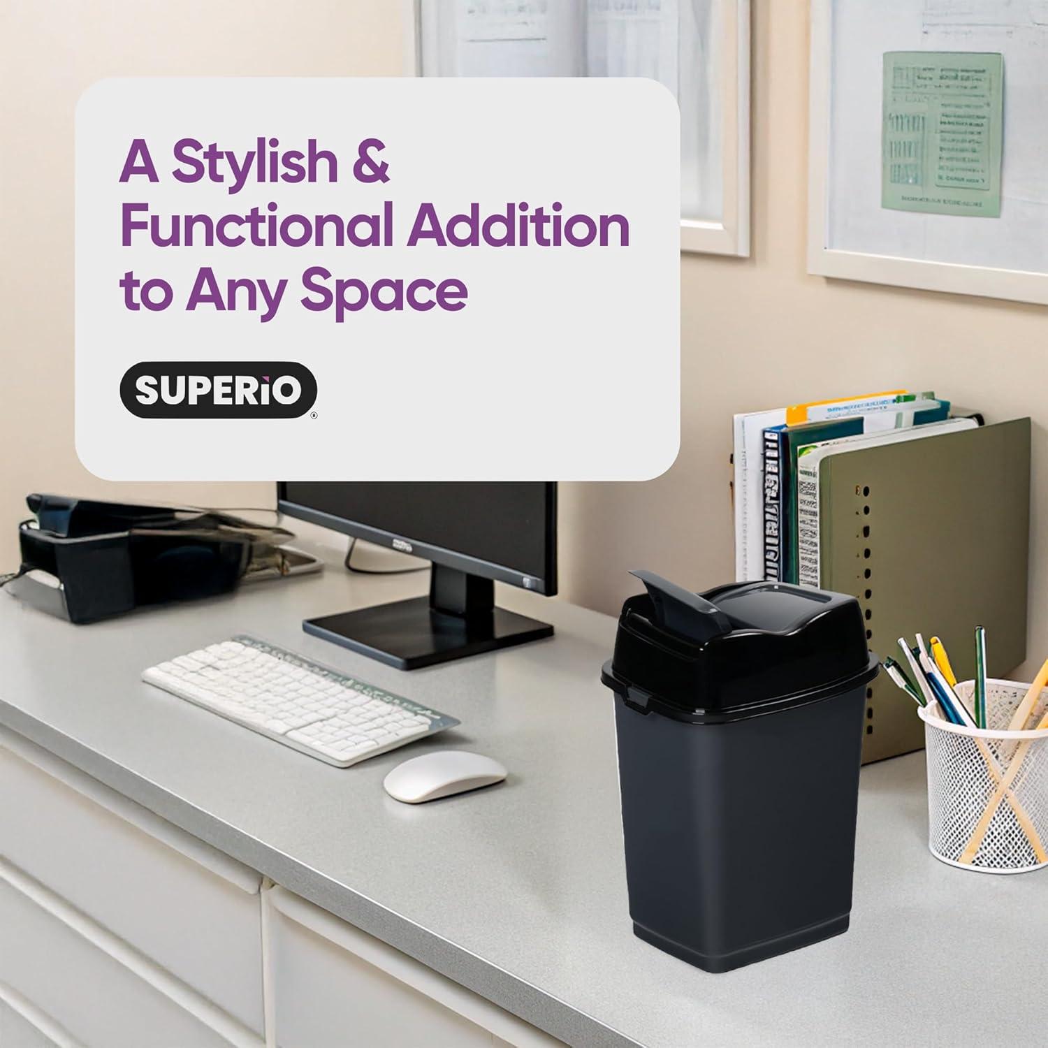 Superio Brand's Garbage Can with Swing Top-Split Lid combines functionality and style, making waste disposal effortless and efficient. Its smooth-swinging split lid allows for quick, mess-free trash disposal while closing securely to keep waste hidden and odors contained. Ideal for bedrooms, bathrooms, or offices, this trash can offers convenience and a clean, streamlined appearance. With a 1.25-gallon (5-liter) capacity, this trash bin can fit effortlessly under a desk or a bathroom sink. The slim profile is designed to fit seamlessly into tight spaces, saving valuable room in busy areas. The sleek black finish and modern design make this trash bin a versatile and attractive addition to any setting. Constructed from durable plastic, this trash can with lid is built to withstand daily use while remaining lightweight and easy to handle. Its fingerprint-resistant surface keeps it looking clean and polished, even with frequent handling. Equipped with sturdy side handles, it ensures a secure grip for hassle-free trash removal. Combining practicality, durability, and style, this swing lid trash can is the perfect solution for your waste management needs.