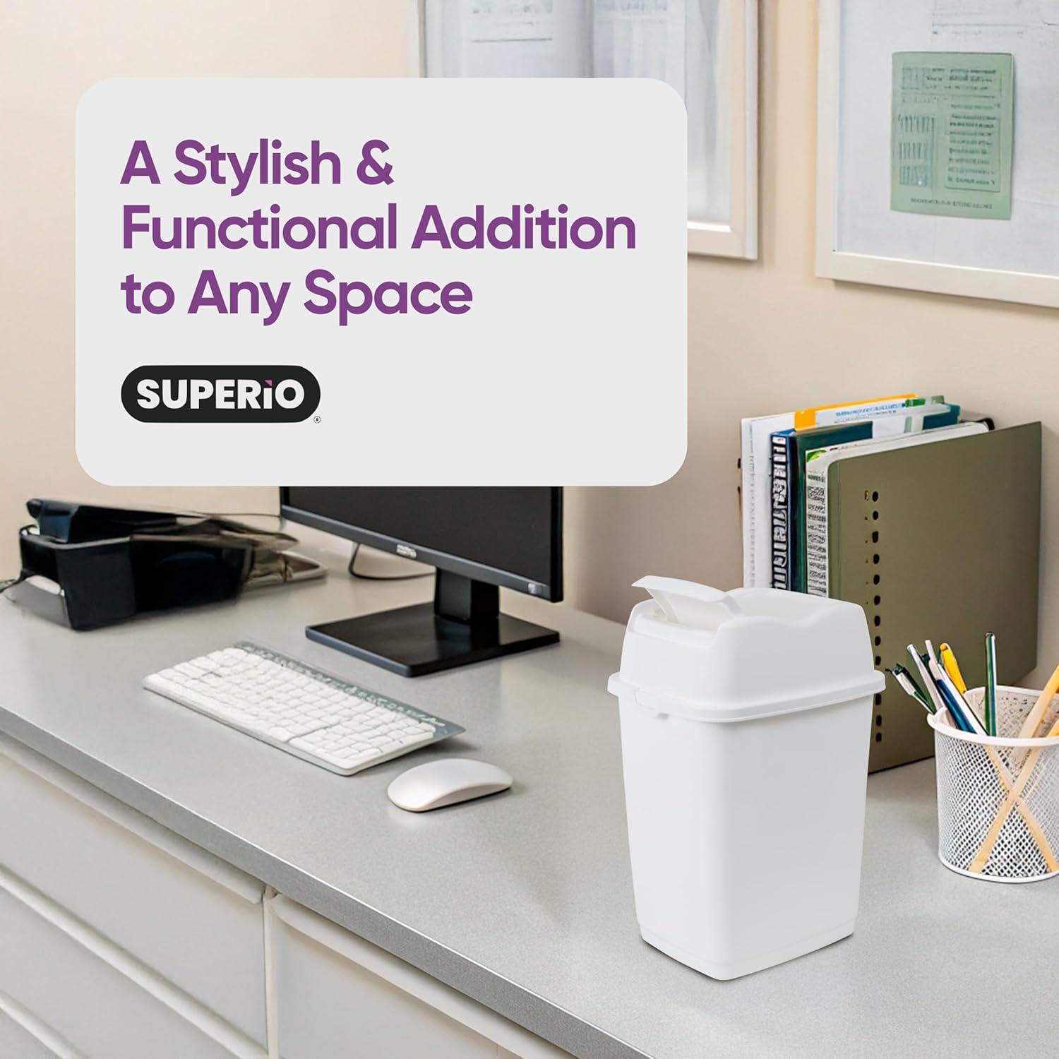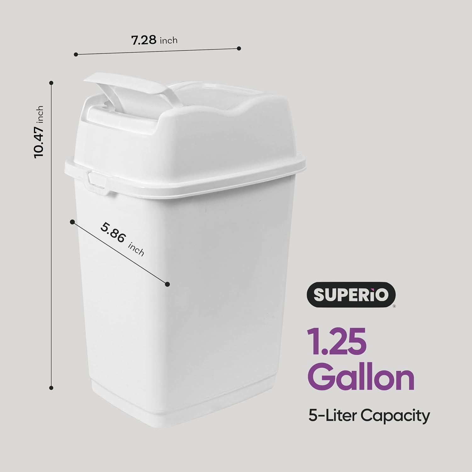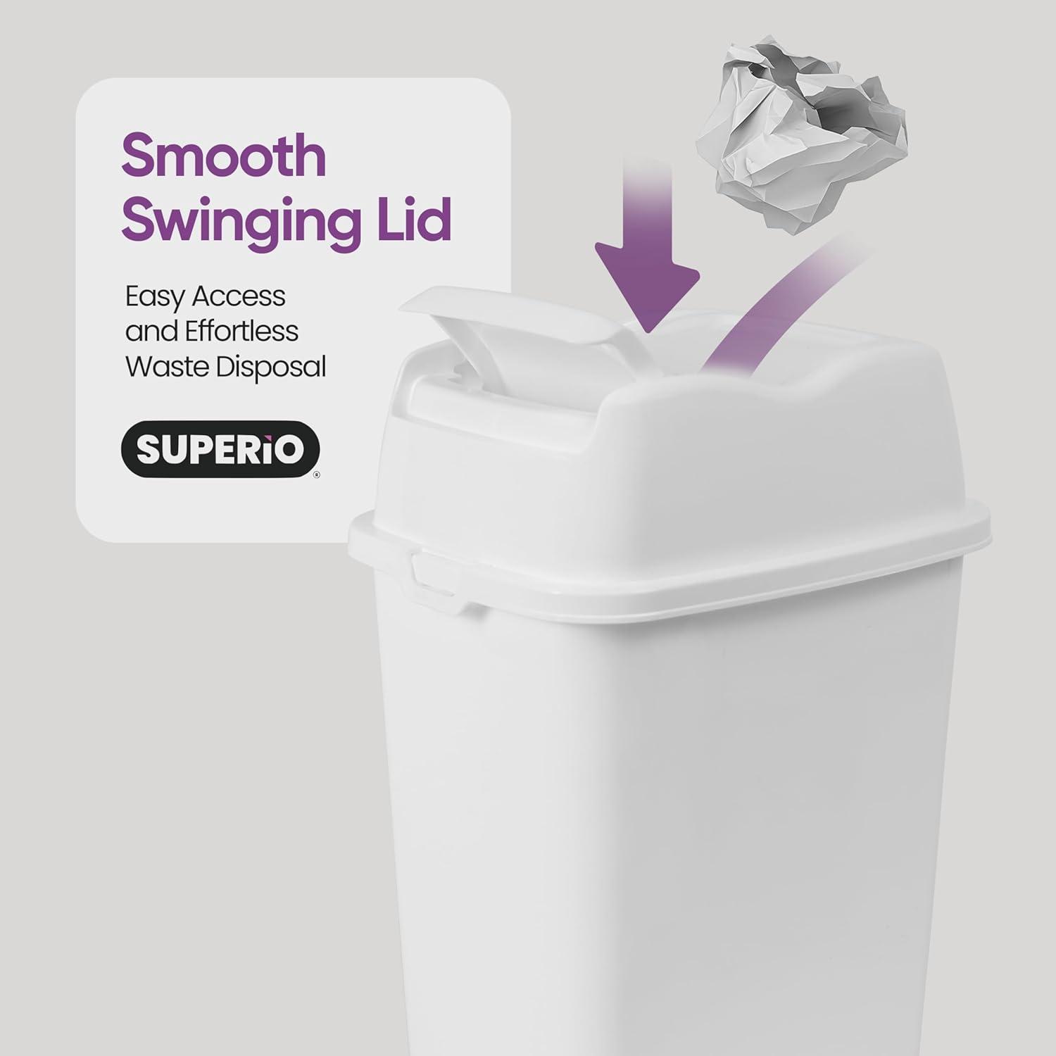 Superio Brand's Garbage Can with Swing Top-Split Lid combines functionality and style, making waste disposal effortless and efficient. Its smooth-swinging split lid allows for quick, mess-free trash disposal while closing securely to keep waste hidden and odors contained. Ideal for bedrooms, bathrooms, or offices, this trash can offers convenience and a clean, streamlined appearance. With a 1.25-gallon (5-liter) capacity, this trash bin can fit effortlessly under a desk or a bathroom sink. The slim profile is designed to fit seamlessly into tight spaces, saving valuable room in busy areas. The sleek black finish and modern design make this trash bin a versatile and attractive addition to any setting. Constructed from durable plastic, this trash can with lid is built to withstand daily use while remaining lightweight and easy to handle. Its fingerprint-resistant surface keeps it looking clean and polished, even with frequent handling. Equipped with sturdy side handles, it ensures a secure grip for hassle-free trash removal. Combining practicality, durability, and style, this swing lid trash can is the perfect solution for your waste management needs.