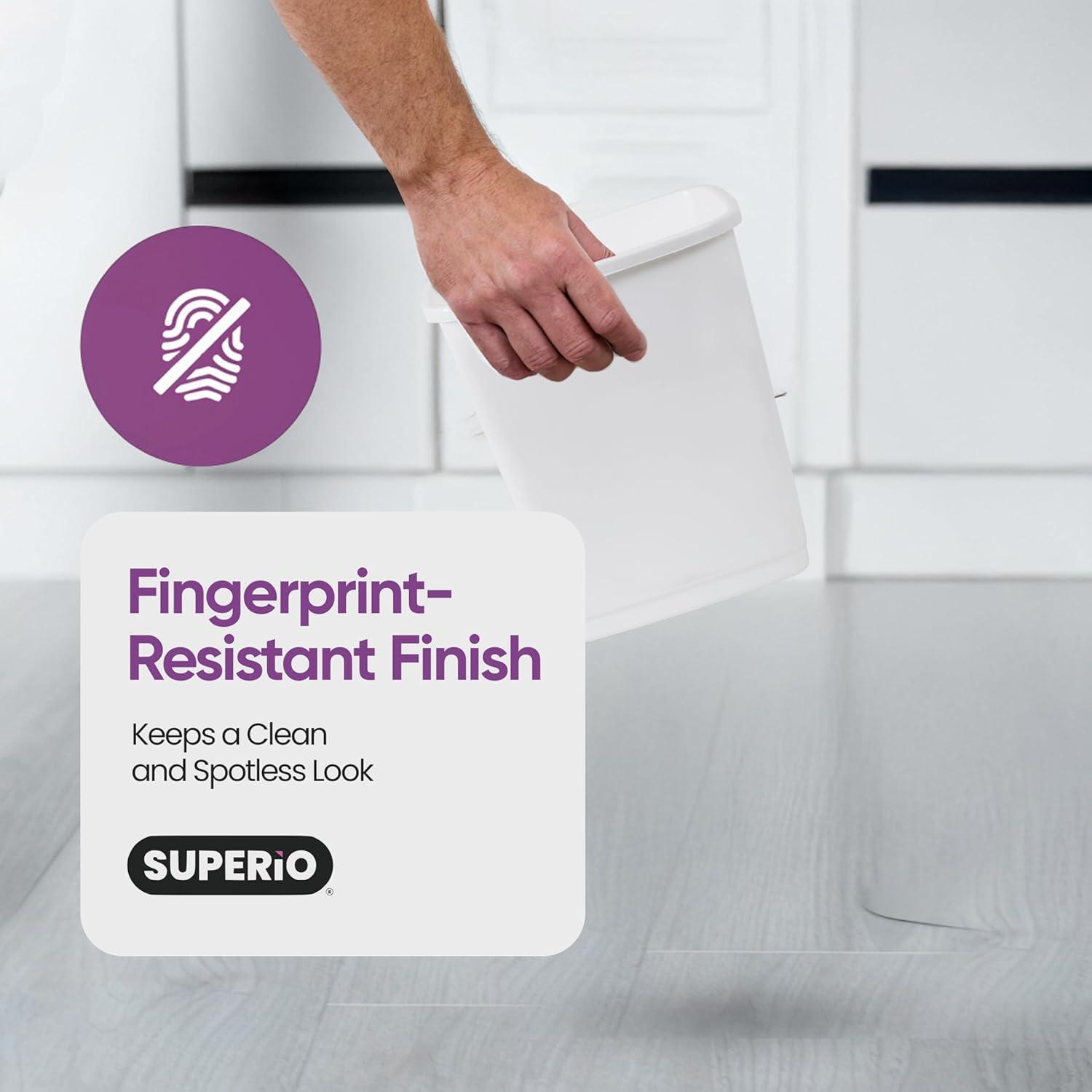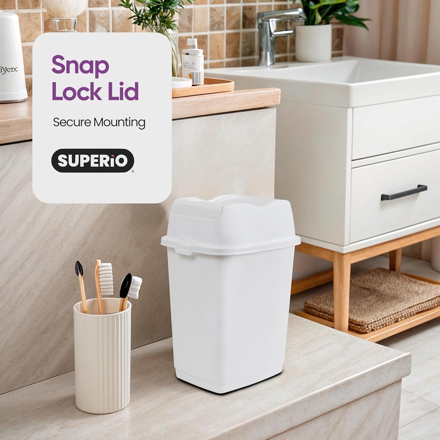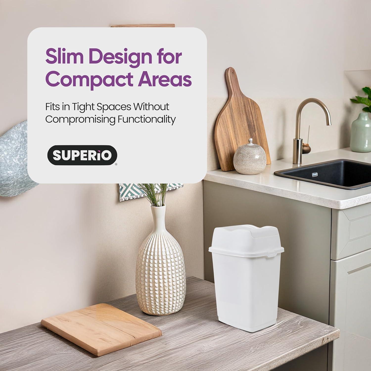 Superio Brand's Garbage Can with Swing Top-Split Lid combines functionality and style, making waste disposal effortless and efficient. Its smooth-swinging split lid allows for quick, mess-free trash disposal while closing securely to keep waste hidden and odors contained. Ideal for bedrooms, bathrooms, or offices, this trash can offers convenience and a clean, streamlined appearance. With a 1.25-gallon (5-liter) capacity, this trash bin can fit effortlessly under a desk or a bathroom sink. The slim profile is designed to fit seamlessly into tight spaces, saving valuable room in busy areas. The sleek black finish and modern design make this trash bin a versatile and attractive addition to any setting. Constructed from durable plastic, this trash can with lid is built to withstand daily use while remaining lightweight and easy to handle. Its fingerprint-resistant surface keeps it looking clean and polished, even with frequent handling. Equipped with sturdy side handles, it ensures a secure grip for hassle-free trash removal. Combining practicality, durability, and style, this swing lid trash can is the perfect solution for your waste management needs.